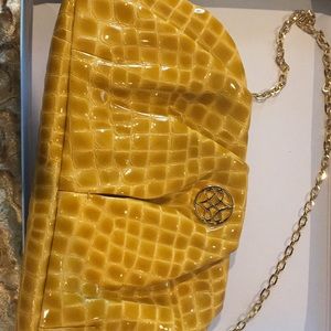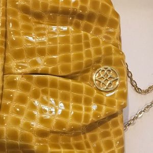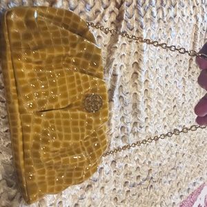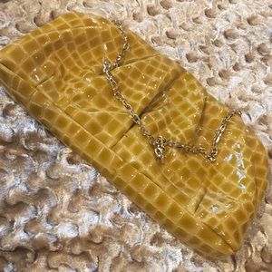 Saffron clutch with faux alligator leather. Gold chain and emblem on front. Magnetic snap enclosure.