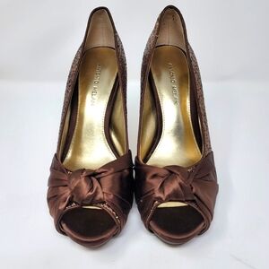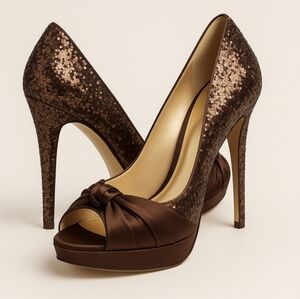 Antonio Melani ✦ Glitter Party Pumps ✦ Brown Satin Knot Peep-Toe Heels Size 10