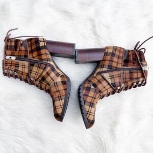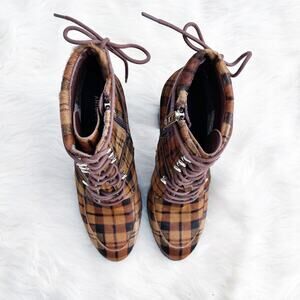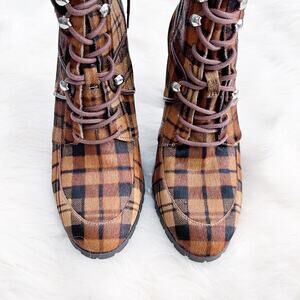 Lace-up detail. Internal zipper. Padded heel. Lug sole. Plaid pattern calf hair.