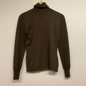 Dark green stretchy turtleneck long sleeve light weight sweater. In the photos the color looks a bit more brown than it does in real life. Some minor pilling. Size medium.