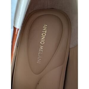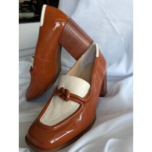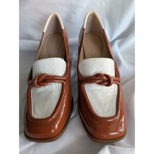 The Antonio Melani Hale Patent Leather Square Toe Heeled Loafers are a vintage-inspired women's shoe in size 7.5. Featuring a stylish square toe, slip-on closure, and block heel, these brown loafers with off-white accents offer a unique and chic platform style. Made from leather with a standard shoe width, these heeled loafers are perfect for adding a touch of sophistication to any outfit.