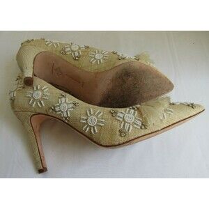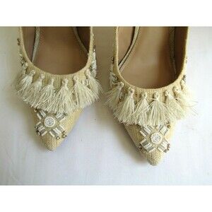 Antonio Melani Heels Beaded Rhinestones Tasseled Tan Shoes Womans Size 9.5 M