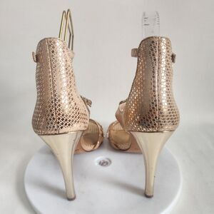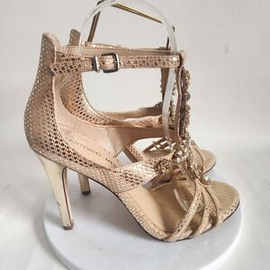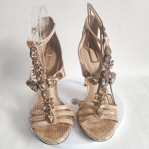 Antonio Melani Leather Sole Pumps 6.5 Shiny Gold Satin T-Strap Rhinestones Heels