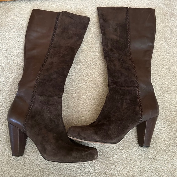Women's Antonio Melani leather and suede boots, brown, full side zipper, high heels, knee high, size 10
