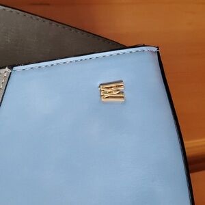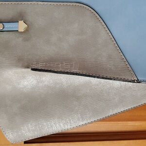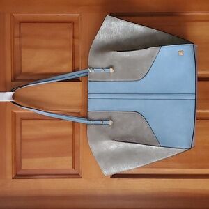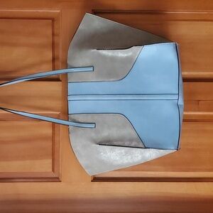 Easy wipe gorgeous light blue and taupe tot bag by Antonio Melani. Taupe side sections have light snakeskin print. Strap fall is 10in. 13.5" x 4.25" x 20". Suede feel inside. Flap pocket on one side and zip on other. Snap enclosure. NWT