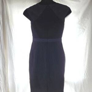 Designer blue and black mini ish dress, stops at the knees.