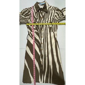 Keywords: Antonio Melani dress, zebra print dress, shirt dress, button down dress, short sleeve dress, brown and white dress, animal print, contemporary dress, career dress, work dress, casual dress, designer dress