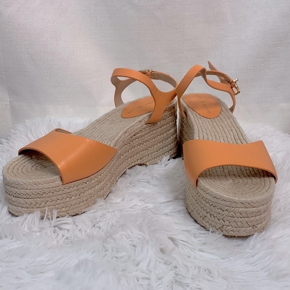 Adorable vibrant peach wedges with tan braided jute stacked heal. Size 8, new with tags, no box. Adjustable straps at the ankle with gold hardware, comfort pad at the heal. Approximately 2” platform, with 3-1/4” heal.