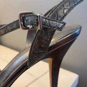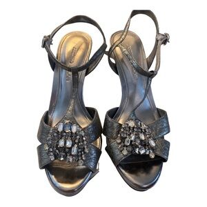 Light pewter platform strappy heels with a fancy, blingy toe. 4.5 inch heels. Worn once. A few knicks on the heels as shown. Fits TTS. Overall great condition.