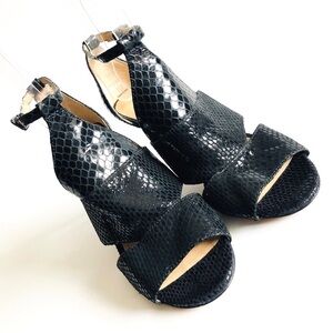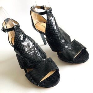 Antonio Melani Phaedra sandals in excellent hardly used condition. Black snake embossed leather uppers, side cutout detail, adjustable ankle strap, stiletto heel. See pictures for heel height.