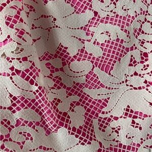 Elevate your wardrobe with this stunning Antonio Melani 2-piece set, perfect for a chic and sophisticated look! This ensemble features a vibrant pink lace overlay with a delicate floral pattern, adding a touch of feminine charm to your style. The set includes a sleeveless crop top and a matching knee-length skirt, both lined with a silky 97% polyester, 3% spandex fabric for a comfortable fit. The intricate lace detailing and scalloped hemline make this outfit ideal for special occasions, date nights, or cocktail events.