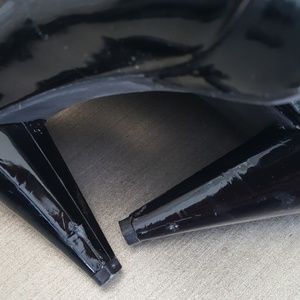 Great condition, worn one or two days at a conference. Body of shoe excellent. Inner heal has some dents from storage (inside the inside back heal area) and one small mar on bottom. See photo. Foot bed clean, very padded 3 3/4 heal at highest point (approx) with 1" (approx) platform, makes for a very easy walk. Patent black leather. These are a premium line shoe, from Dillards, runs true to size with a nice roomy toe bed.