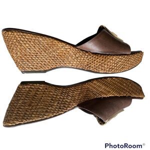 Antonio Melani Platform Sandals Mules, Size 6 1/2 Brown Buckles with Gold Metal