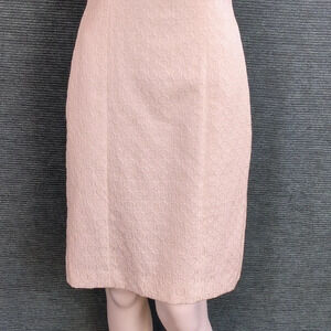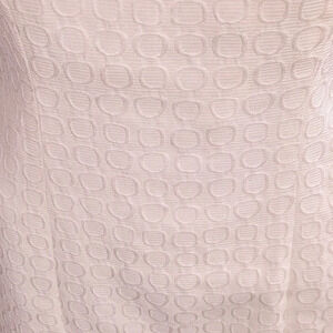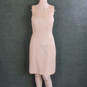 Fitted sheath dress with round neckline that features an open weave, square lattice yoke made of fabric strips that are Satin/Cotton blend. There is a button at the top, forming a keyhole.