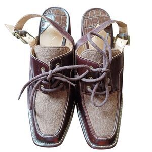 Antonio Melani Shoes 9M Brown Leather Felt Block Heel Slingback Lace Up Retro