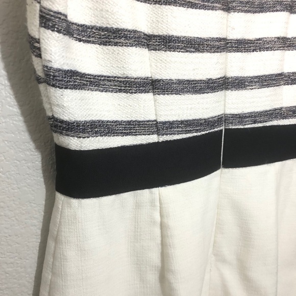 Sheath color block striped dress by Antonio Melani, blue shimmery knit striped on top, black built in belt, and white bottom. Great preloved condition, no visible stains or tears, very minimal signs of wear by the underarms. Perfect as wedding holiday career wear.