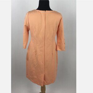 Elegant peach orange dress with intricate laser cut eyelet detailing. Knee-length, 3/4 length sleeves, back zip closure, fully lined, scoop neckline. Flattering and a great 4 season option.
