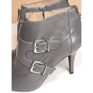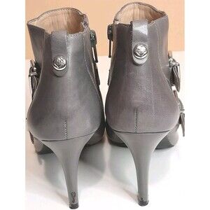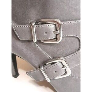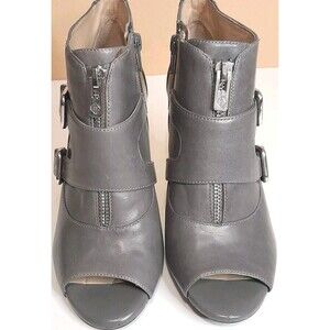 Antonio Melani Sz 6 Ankle Bootie Gray Leather Open-Toe Heels w Zippers & Buckles