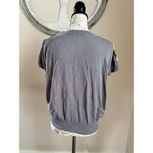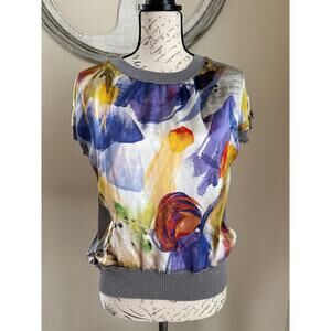 Elegant Antonio Melani women’s blouse top in size Medium. Features a knit gray back and sleeves with a colorful abstract floral print front panel. Lightweight and versatile, perfect for work, casual wear, or evening outings. Made in Italy with quality fabric blend for comfort and style.