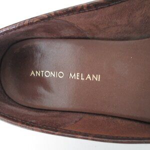Antonio Melani Womens Brown Hand-tooled Leather Flat Loafer. Size 9M. Made in Brazil. Previously owned and moderately used, leather uppers are in excellent condition, while the soles & heels reveal moderate use.