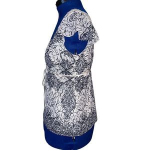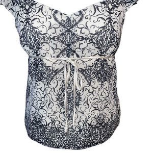 Antonio Melani White/Black Short Sleeve Aline Blouse 2. Pre-Owned, Good Condition. V neck. Short sleeves. Drawstring tie accent. White/ivory/black print. 100% polyester