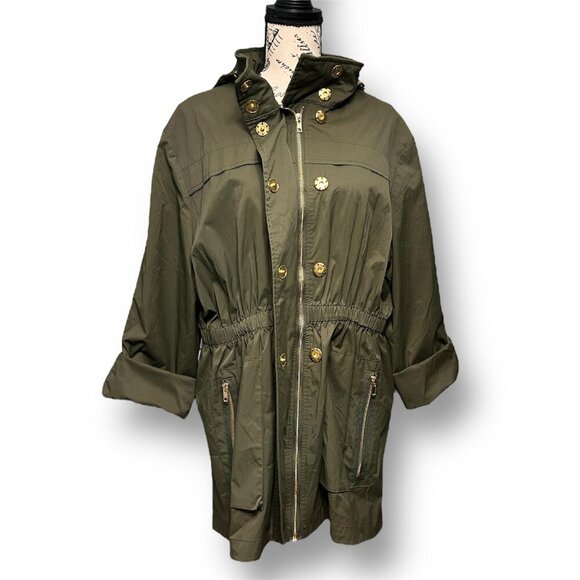 Antonio Melani XL Olive Green Hooded Utility Trench Coat Gold Zip Jacket Fall