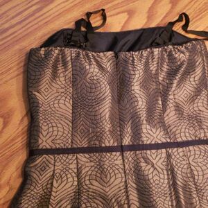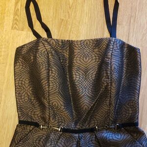 You will kill it in this beautiful bronze stitched pattern short gown. Removable straps. Burnished brass detail at waist. Boning in the bodice. Fully lined. Zipper back. Size 2.