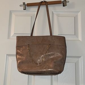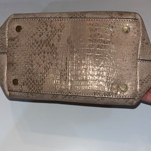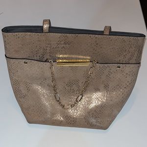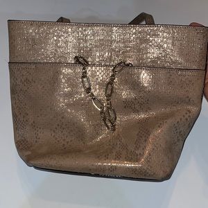 Antonio Melani gold leather snakeskin medium size purse. Main storage area and two side pockets all have magnet closure. Gold chain detail on each side that can also be tucked into the side pockets for a different look. Purse is gently worn and in excellent condition.