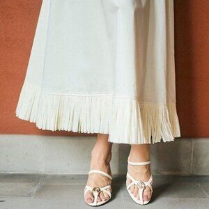 Antonio Melani sandals, M.G. Style collab, leather dress sandals, shell embellished heels, resort wear shoes, cream heels, women’s size 7 sandals, elegant summer footwear, luxury sandals, dressy leather sandals