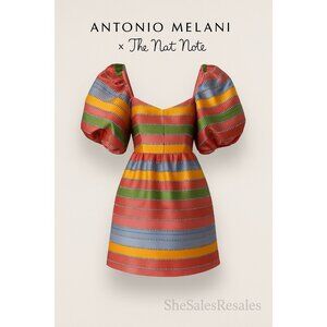 Description: Bright, bold, and full of personality — this Antonio Melani x The Nat Note Nell Dress is a statement piece. Featuring a vibrant multicolor striped jacquard fabric, this mini dress is designed with dramatic puff sleeves and a flattering square neckline. Perfect for parties, brunches, or any occasion that calls for a playful yet polished look.