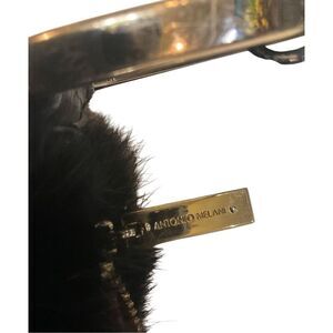 Gorgeous Antonio Melani black rabbit fur and leather purse with alligator embossed leather strap and gold and black hardware and zipper in gold with gold signed charm. Inside is fuchsia colored satin with zippered pocket and 3 open pockets . Worn once. Measures w14x h 9 without strap and H 15 with strap. Just perfect to accessorize that little black dress!
