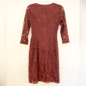 Antonio Melanie burgundy colored lace dress size 2. Fully lined except sleeves. Brand tag is hanging by a few threads but other than that great condition. Professional business attire or Semi-formal party attire.