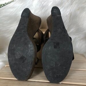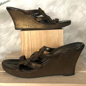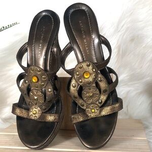 Antonio Milani Bahama Leather Wedge Sandal. Leather upper, metallic bronze accents with two orange rhinestones on each shoe. Pre-owned condition, normal wear. Please see images for actual condition, no major defects.
