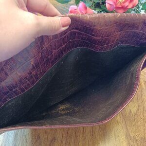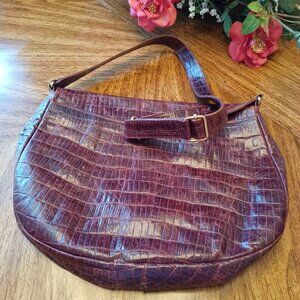 European vintage, made in Italy. By: Antonio Scepi. Deep chocolate brown crocodile embossed leather tote with gold(tone) hardware. I used this for my smaller books in college, when the outfit called for it. Sturdy construction, supple leather. Adjustable strap.