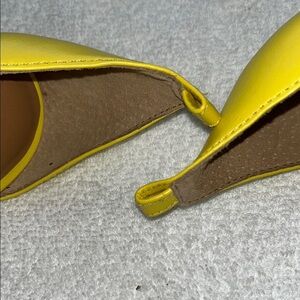Elevate your style with Aldo's stunning yellow heels, featuring a chic d'Orsay design and a sleek satin finish. These heels are perfect for making a bold statement at any special occasion, combining elegance with a vibrant pop of color.used good condition He doesn’t have the strap. Comes with no strap.