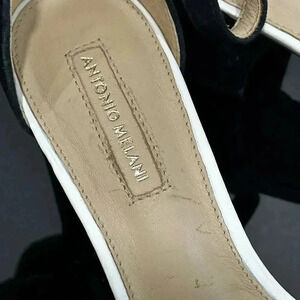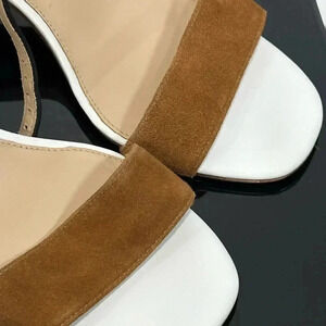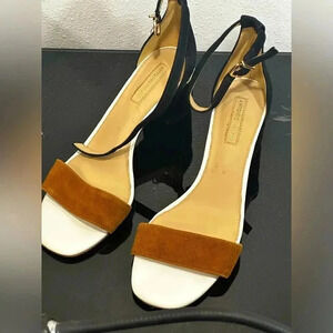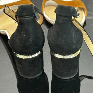 New suede sandals never used. Few scuffs throughout due to storage. Tan/blk suede with gold-tone hardware.
