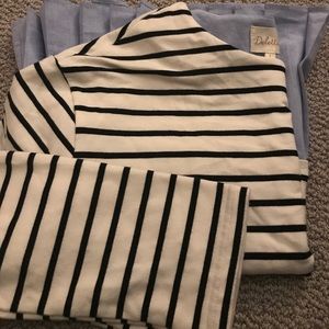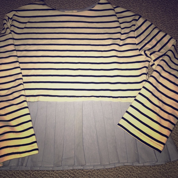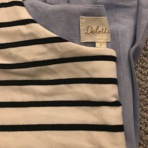Anthropologie black and white striped shirt with blue pleats at the bottoms size small. Brand is delta it is a loose fitting top.