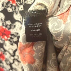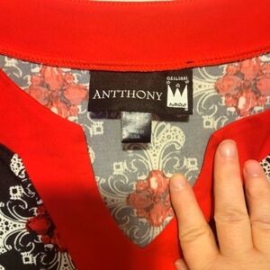 This blouse is a beautiful Antthony Design Originals. It is a V-Neck and is short Sleeve. The colors are a vibrant Red, Black and White. Material is 92% Polyester and 8% Spandex. It is preowned but looks new. Measurements are
