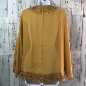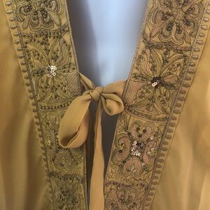 Deep gold, beaded trim detail, center tie closure, small faded spots on upper shoulder see picture,colors may vary due to lighting, good used condition, Sz: L