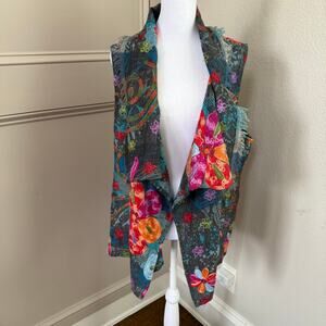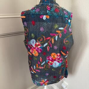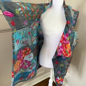 Add a vibrant layer to your look with this Anu 100% Wool Embroidered Open Vest in Size M. Featuring a gray-blue wool base with intricate, colorful embroidery, this piece makes a bold statement while staying cozy. Perfect for layering over dresses, blouses, or turtlenecks to bring a touch of artisan craftsmanship and boho charm to your outfit.
