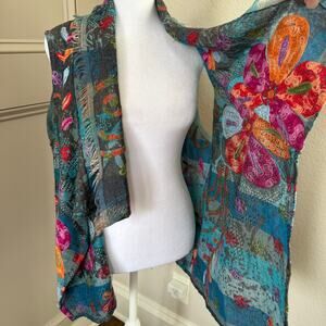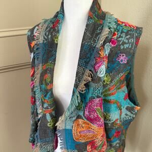 Anu 100% Wool Embroidered Vest Gray Blue Boho Open Front Bright Colorful Size M