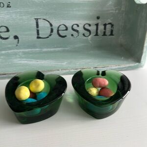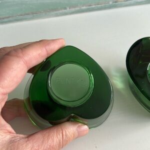 Two green glass heart shaped tea light candle holders, designed by Anu Pentik, excellent condition, no nicks or cracks. Very nice, heavy glass.
