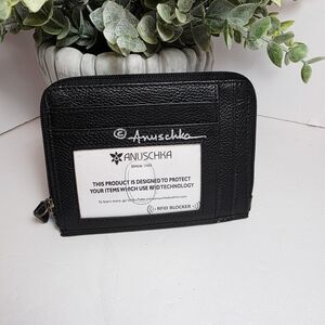 Elegant black Anuschka RFID card wallet featuring a beautiful gold floral and butterfly design. Includes a zipper pouch, card slots and cash pockets.