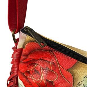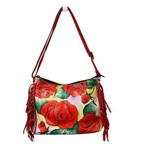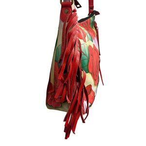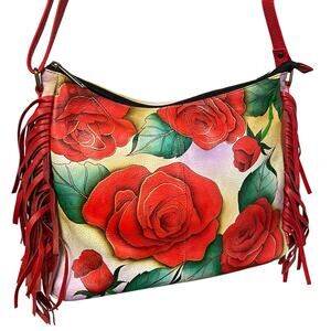 • Features: Single adjustable shoulder strap, Hand painted leather with vibrant floral rose pattern, Red fringe leather trim on sides, Main compartment zip up closure, Exterior back zip up pocket and slip pocket, Hardware feet on bottom, Multiple interior compartments including an RFID Blocker card holder, Comes with attached matching coin purse inside