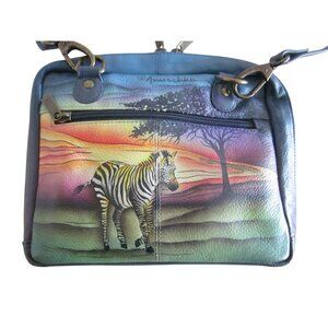 Anuschka Genuine Leather handpainted crossbody bag with zebra sunset design.