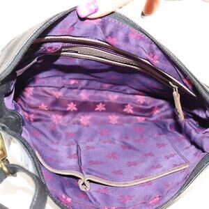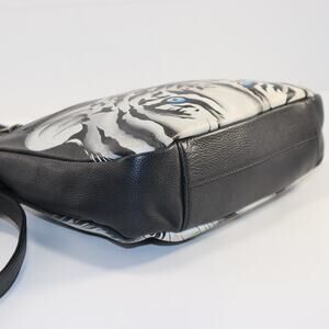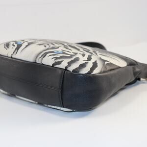 Unique Anuschka genuine leather crossbody/shoulder bag featuring a stunning hand-painted white tiger design with vivid blue eyes. Soft, high-quality leather with a rich purple floral interior. Good condition with light signs of wear consistent with normal use.