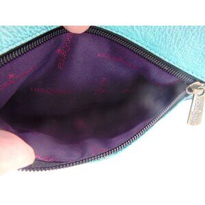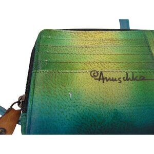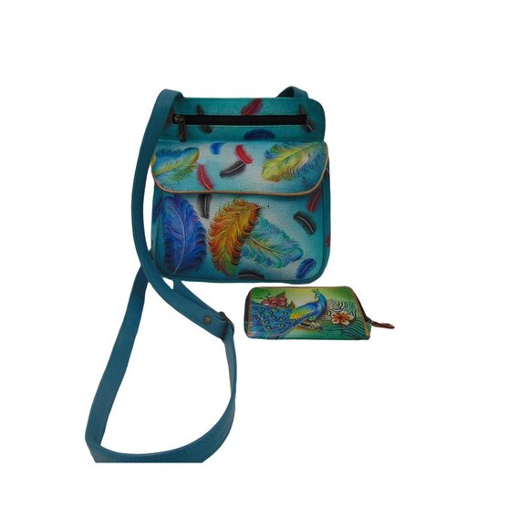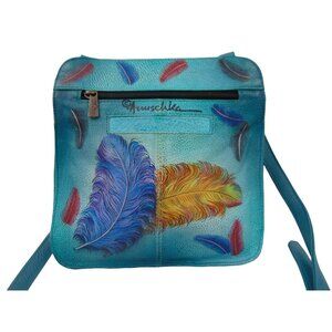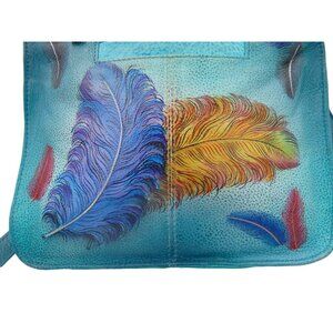 Anuschka Leather Crossbody Purse Wallet Teal Blue Feather Peacock Hand Painted