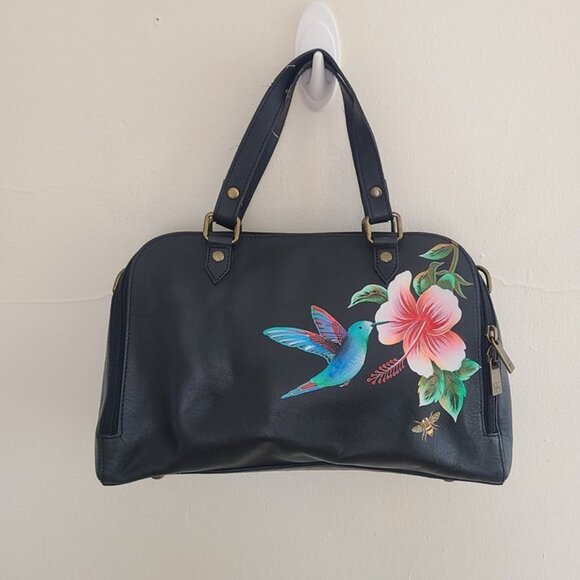 Anuschka Leather Hand Painted Wide Organizer Satchel Hummingbird Black