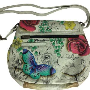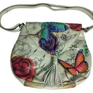 Anuschka Handpainted Leather Medium Shoulder Bag Tassel Flap Floral Butterfly