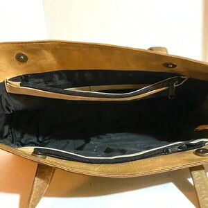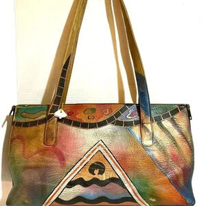 Anuschka hand painted multicolor leather shoulder handbag with brass hardware 5 compartment 3 pockets at interior wall 1 zip closure & snap closure at top height 9” width 16.5” depth 4.5” strap drop 13”